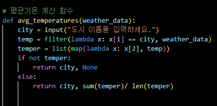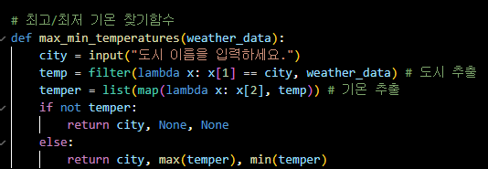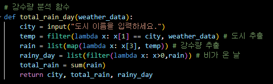 - filter()와 lambda를 사용해서 wether_data에 입력받은 city가 있는 리스트만 추출